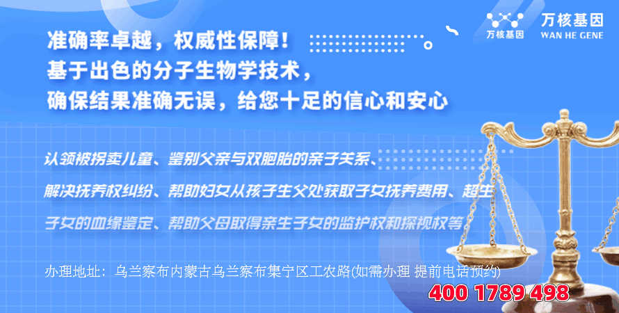 在乌兰察布,可快速办理:打官司司法亲子鉴定、亲子关系鉴定、亲缘关系鉴定、个体识别鉴定等等亲子鉴定,乌兰察布打官司司法亲子鉴定办理地址:乌兰察布内蒙古乌兰察布集宁区工农路(如需办理,需提前预约)预约电话:4001789498。